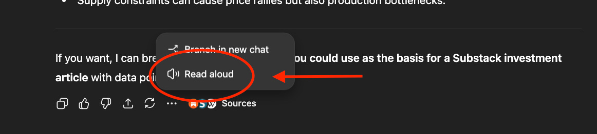 Pro Tip: ChatGPT allows you to enter a written question by typing and allows you to have the answer be read aloud back to you. This is useful for ‘brain dumps’ where you might type 10 or so questions and come back to them later or want to listen to them on the go. No reading involved - it’s like a podcast that you can pick back up whenever your ready with the same stream of thought you were in earlier or even a week ago!